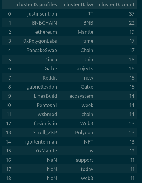 Figura 3: Por cada cluster obtengo las palabras más usadas en sus tweets. Por ejemplo: BNB, Polygon, NFT, Chain, web3, todas palabras relacionadas a las criptomonedas.
