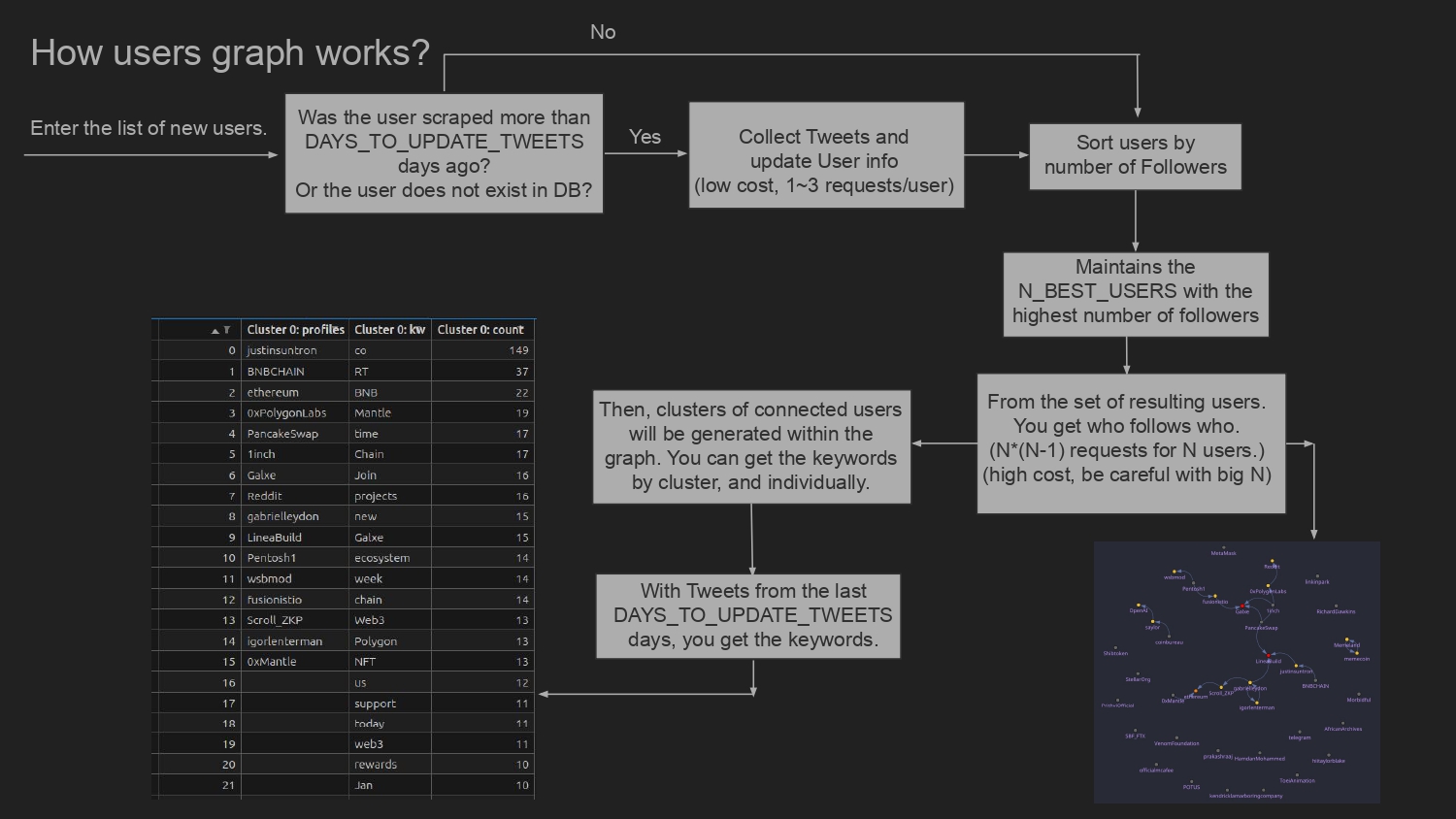 MongoDBy actualización diaria.Grafo de seguidores/seguidosycluster de usuarios.- Palabras clave repetidas usadas por cada cluster de usuarios.