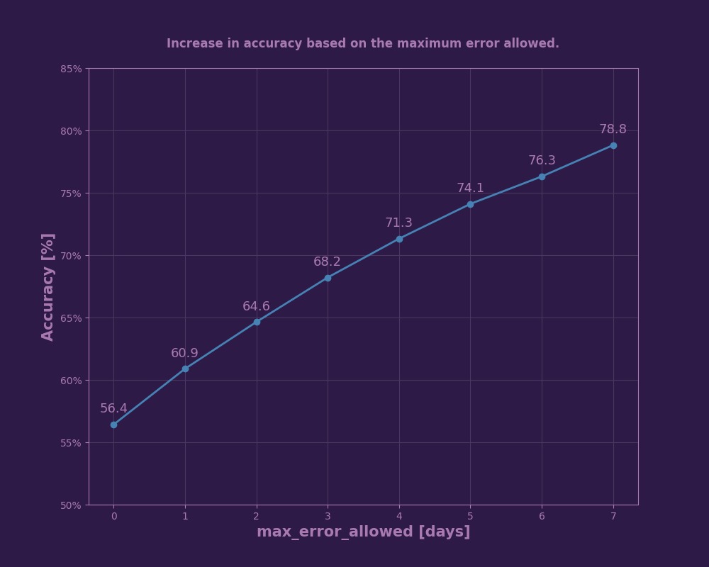 - La Figura 2 muestra el error del modelo; en el eje horizontal está la diferencia entre la fecha real de compra y la predicha.